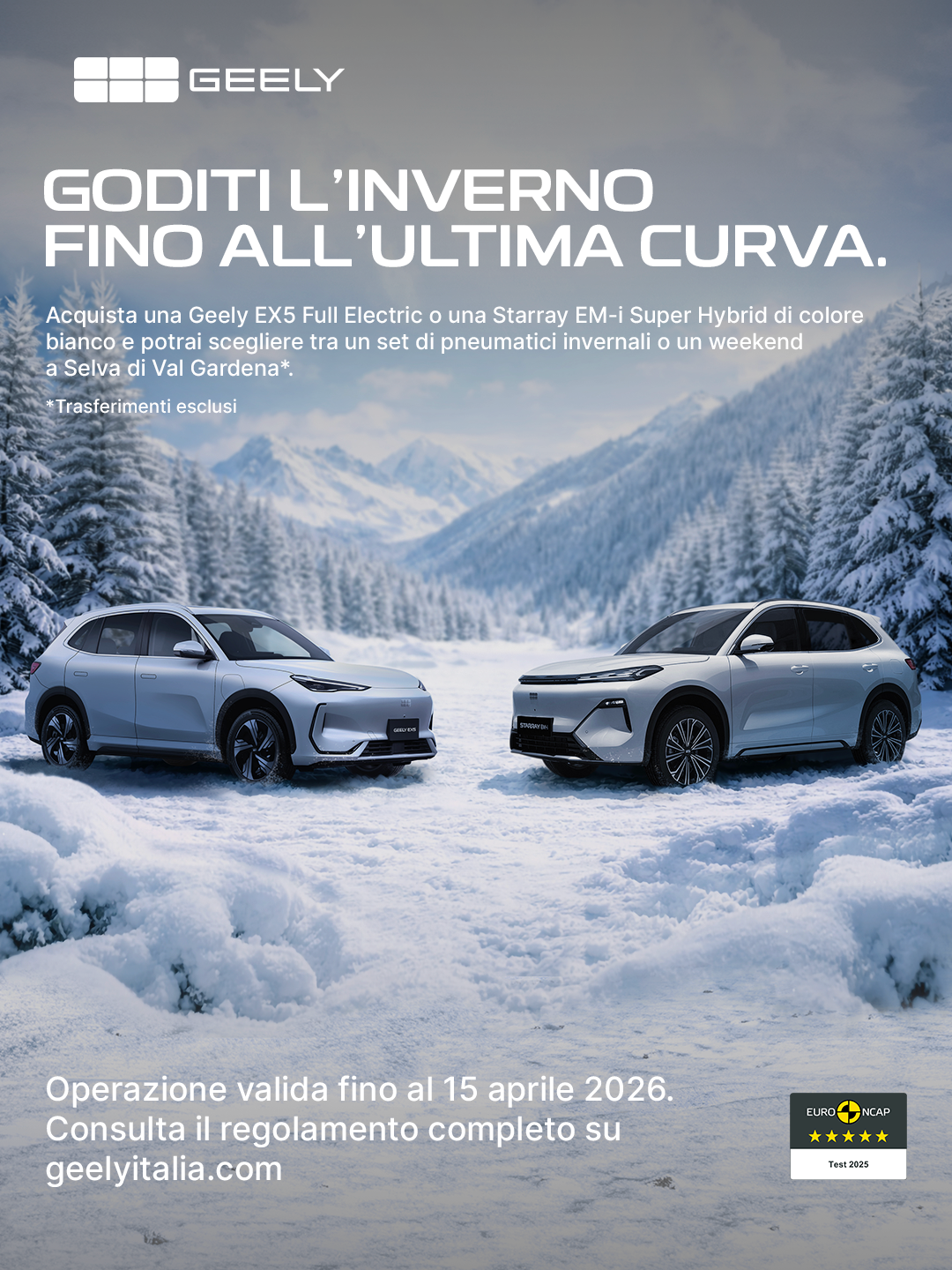 Acquistando una Geely EX5 Full Electric o una Starray EM-i Super Hybrid in pronta consegna di colore bianco, potrai personalizzare il tuo premio invernale scegliendo tra sicurezza e relax. La promozione è valida fino al 15 aprile 2026.